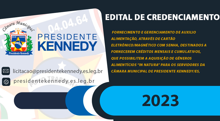 A Câmara Municipal de Presidente Kennedy anunciou hoje o Edital de Chamamento Público Credenciamento N°001/2023, com o objetivo de selecionar empresas especializadas na prestação de serviços de administração, fornecimento e gerenciamento de Auxílio Alimentação. O edital visa estabelecer parcerias que permitam oferecer benefícios essenciais aos servidores municipais.