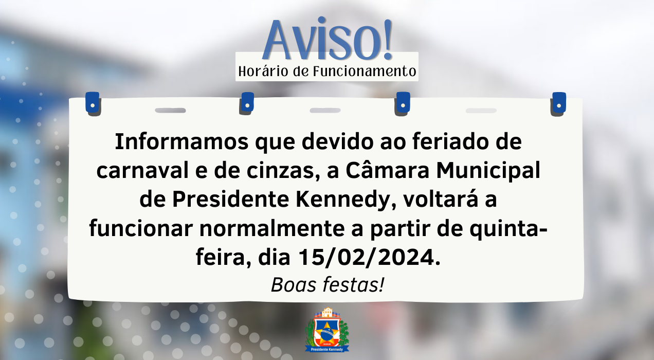 Devido ao feriado de Carnaval e de Cinzas, a Câmara Municipal de Presidente Kennedy estará fechada até o dia 14/02/2024. As atividades serão retomadas normalmente a partir do dia 15/02/2024.