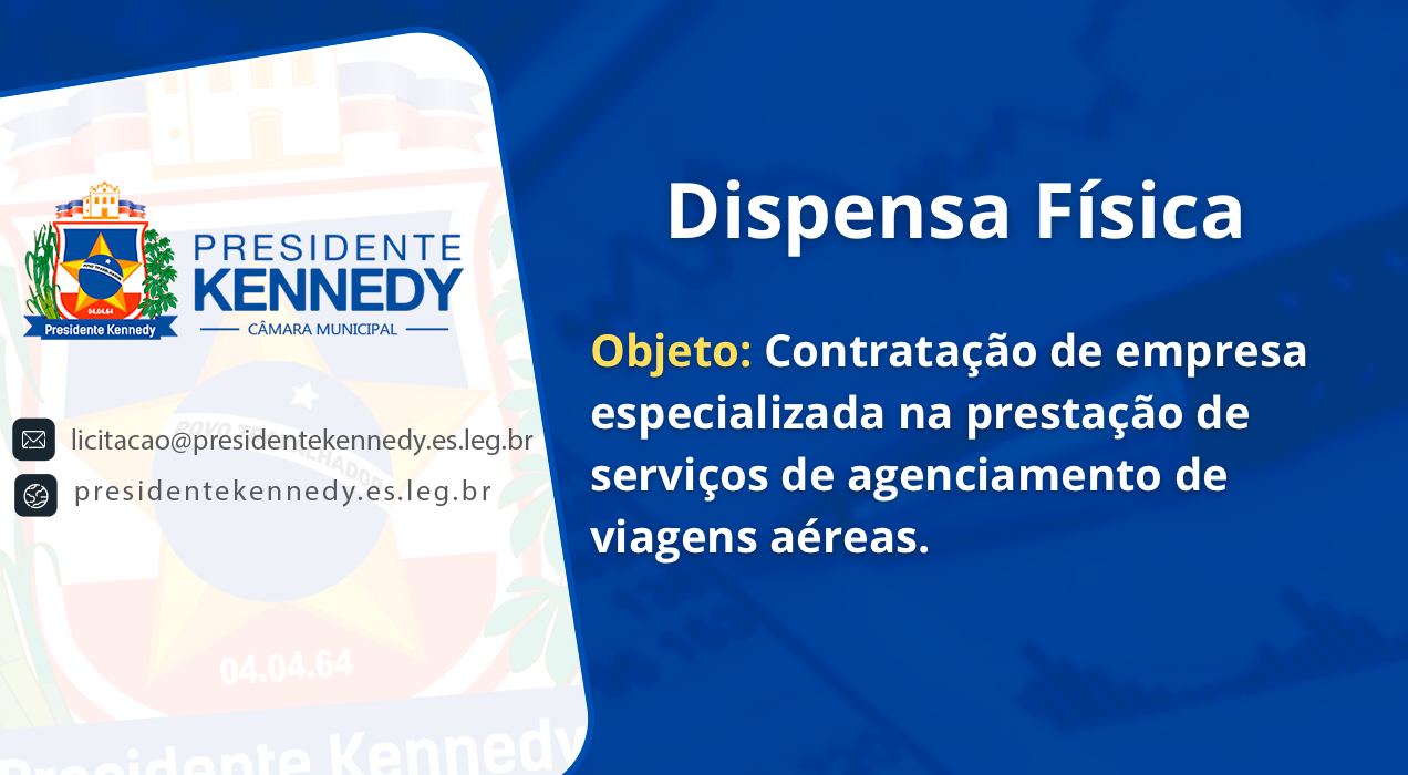 A Câmara Municipal de Presidente Kennedy iniciará nesta sexta-feira, 17 de outubro de 2025, a Dispensa Física nº 90021/2025, para contratação de empresa especializada na prestação de serviços de agenciamento de viagens aéreas.