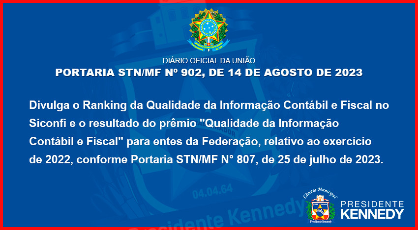 Divulga o Ranking da Qualidade da Informação Contábil e Fiscal no Siconfi e o resultado do prêmio "Qualidade da Informação Contábil e Fiscal" para entes da Federação, relativo ao exercício de 2022, conforme Portaria STN/MF N° 807, de 25 de julho de 2023.