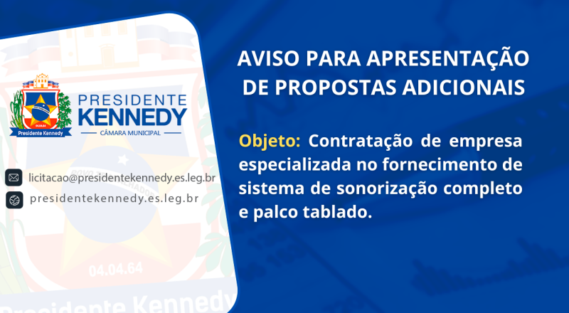 A CÂMARA MUNICIPAL DE PRESIDENTE KENNEDY DO ESTADO DO ESPÍRITO SANTO TORNA PÚBLICO O AVISO PARA APRESENTAÇÃO DE PROPOSTAS ADICIONAIS